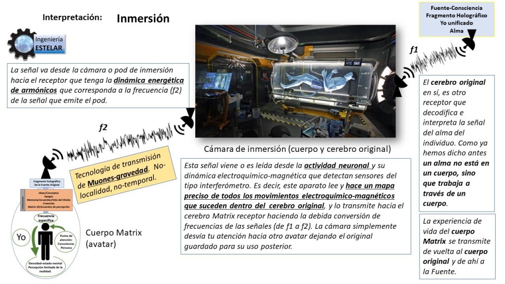 En la siguiente imagen, y en función la información que Anéeka de Temmer nos compartió en su día, vemos de una forma muy resumida cómo funciona el pod de inmersión. Esta imagen explicada la podéis encontrar también en mi video de YouTube «V7 Conexión alma mente consciencia fuente cuerpo Concepto ET»: https://youtu.be/tgP8M0QA6ek (minuto 25). Como la comunicación con el avatar es con tecnología de transmisión por mounes-gravedad (instantánea), el pod puede estar situado en una nave a muchos km del lugar donde este el avatar o en un planeta a muchos años luz de distancia.