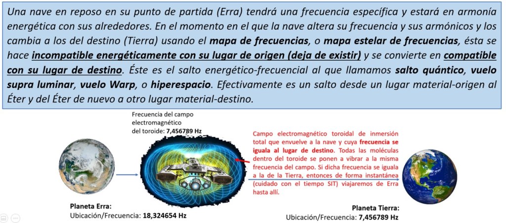 Cuando la frecuencia del toroide equivale a la del destino, la nave deja de ‘existir’ en su lugar de origen, salta al Éter (dentro de su toroide pues es desde el Éter que se manifiesta todo) y al estar en equivalencia de frecuencias con su destino, desciende del Éter a éste, con ello completando el viaje o salto. En esta imagen se muestra este principio: