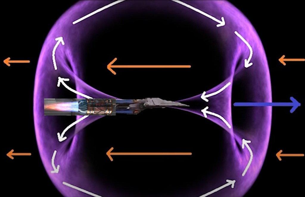Es decir, que cada punto en el universo o destino tiene una frecuencia específica y si hacemos que la nave posea de alguna manera dicha frecuencia estaremos haciendo compatible la nave con el destino e incompatible con el origen. Esto se consigue generando un toroide energético que envuelva a la nave y la haga vibrar a la frecuencia del destino. Esto de realiza aplicando la ley de las frecuencias dominantes que dice que cualquier frecuencia más fuerte que otra(s) convertirá a las más débiles en si misma, las asimilará. El toroide energético de una nave, envolverá a la misma nave que lo genera y a todo lo que esté dentro de ella, en una burbuja en donde su frecuencia vibración existencial (llámese densidad como en 3D ó 5D) será la equivalente exacta a la emitida por el motor. En la imagen siguiente creada por Swaruu se muestra este principio: