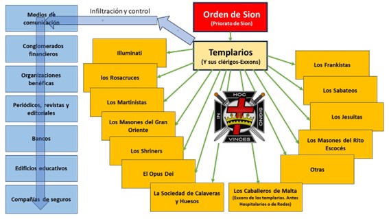 Es tremendamente complicado, oscuro y laberíntico establecer una clara imagen de cómo están articulados los Templarios con el resto de las sociedades secretas y hasta dónde llega su infiltración y control en entidades públicas y privadas en todo el mundo. Lo que sí parece estar claro es que sirven a una sociedad más oscura y elusiva que es la Orden de Sion (Priorato de Sion desde el año 1.118) y que se supone que no existe.