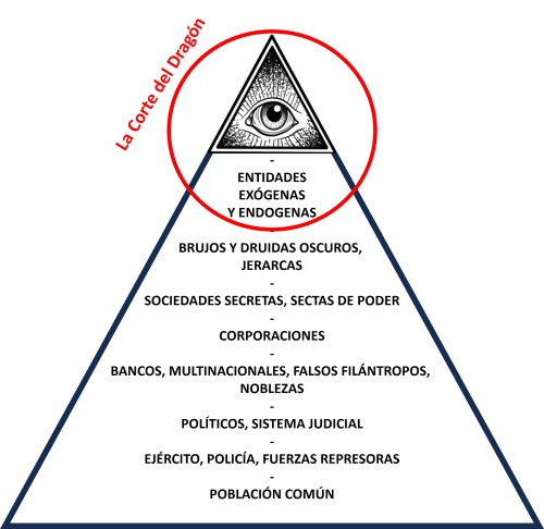 Comenzamos por los que Jaconor73 denomina deidades arcontes. Estas están por debajo de la Fuente de la Oscuridad —de donde emana toda maldad— con la que están más en contacto. Son entidades interdimensionales de gran poder mental que están en lo más alto de la pirámide de control de La Corte del Dragón. Dichas entidades tienen parasitados mental y espiritualmente a todos los que están por debajo de ellos en la pirámide de poder.